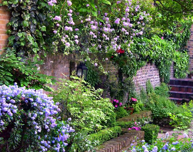 This area of the garden gets almost no sunlight, it is also very damp. Due in part to poor drainage. Therefore this area was an extreme challenge. I knew that any plants put directly into the soil would stand an excellent chance of root rot. This is the area now dubbed "Fagan's Grotto". The very back portion of the garden you can seen in this photo. It is still a work in progress. We have decided on white standard (tree), roses across the back of the two beds, (the beds behind the rose trees in the pots), I think lavender between them would be lovely. Then we are going to do a modified knot garden sort of thing with boxwood and other "carvable" shrubs.