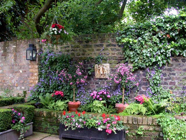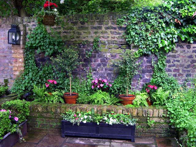 I planted fuschia trees in pots, along with tuberous begonias and a New Guinea impatien. I placed a previously unused window box in front, because again, I could control the water. Which was also the reason for putting the other plants in pots. Of course, the pots were not weathered so I had to paint and distress them so they looked like they belonged in a proper English garden. I also planted and hung a hanging basket from the magnolia tree above. It really does look very "grottoish". This was after about a month.