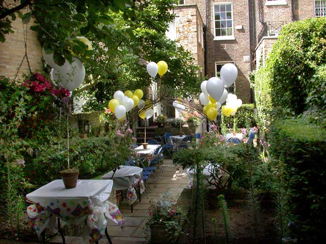 This is the garden all ready for the "Doggy Charity BBQ" we had for Sooty, (the dog's), friend Gaia. It was to raise money for guide dogs. Gaia adores dogs and the guide dog program here is given no money from the government. She raised about 400 pounds. There were about 40 people here, 10 being girls around 10-11 years old. It was great fun. Gaia's dad is a chef at a posh restaurant in Knightsbridge. Luckily he did all the food.