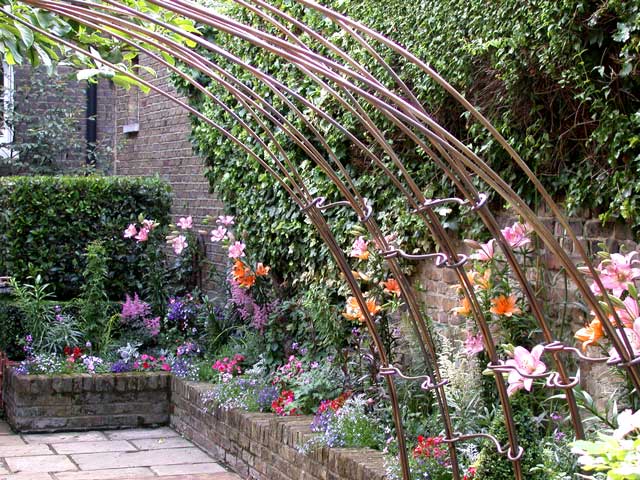 Here is something I never dreamed I would get! An arbor. Not just any sorry old arbor, but a "one off" piece. Giusseppe Lund who built the Queen's Gates at Hyde Park to commemorate the Queen Mum's Birthday is the artist. He is in the picture welding it together. It is lovely and we will be planting David Austin roses to ramble up it. Although we can't get the rose we want until fall. It is a tiny white rambler called Paul's Himalayan Musk. We saw it at the Chelsea Flower show.