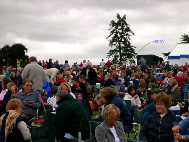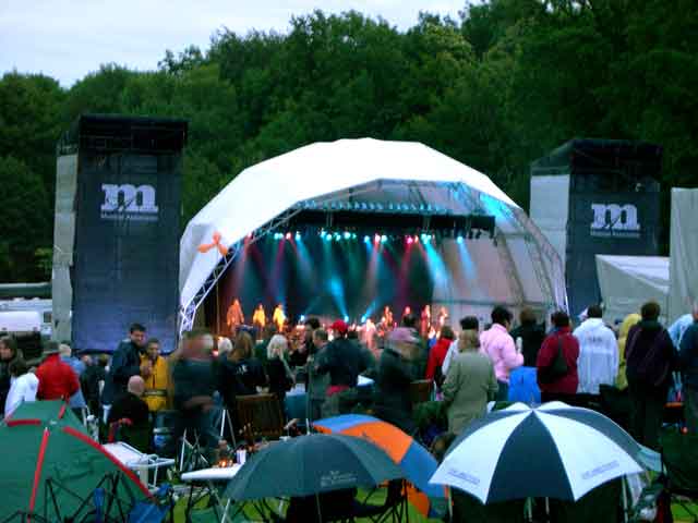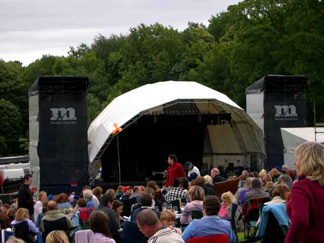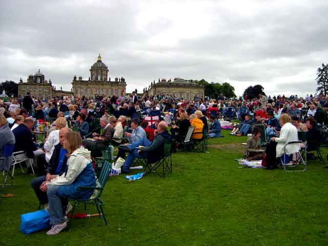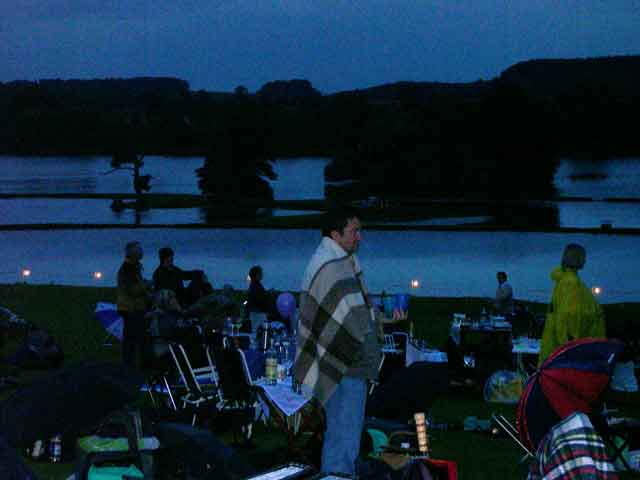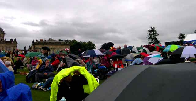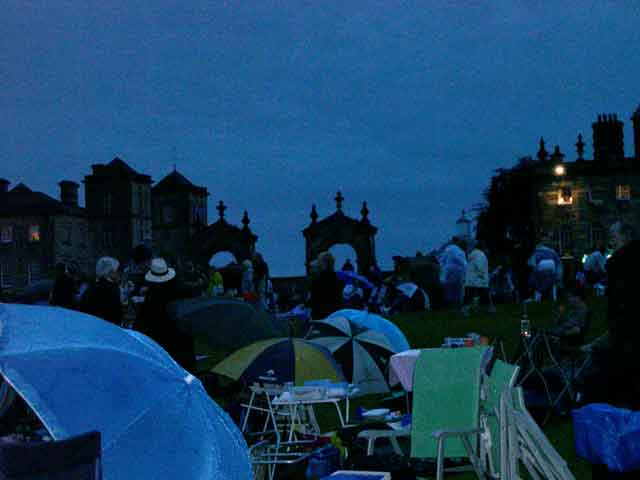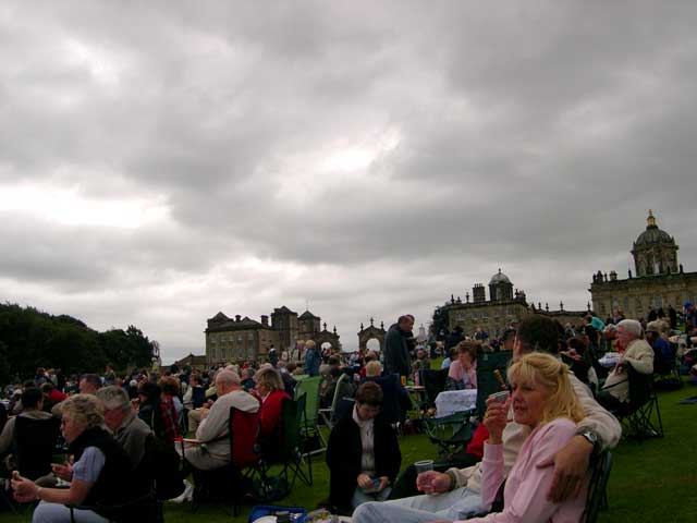 This isn't too bad, just a bit of a sprinkle ... it will pass before Tom comes out. Where is he anyway? We want Tom! We want Tom! (This actually was being chanted by a very merry bloke of about 60 years, who was sitting behind us. The cause of his merriment was a bottle of scotch.) Dave asked when booking the tickets if the show would be canceled in case of rain, the woman at Castle Howard replied, "Why Mr. Tom Jones won't mind if it rains."