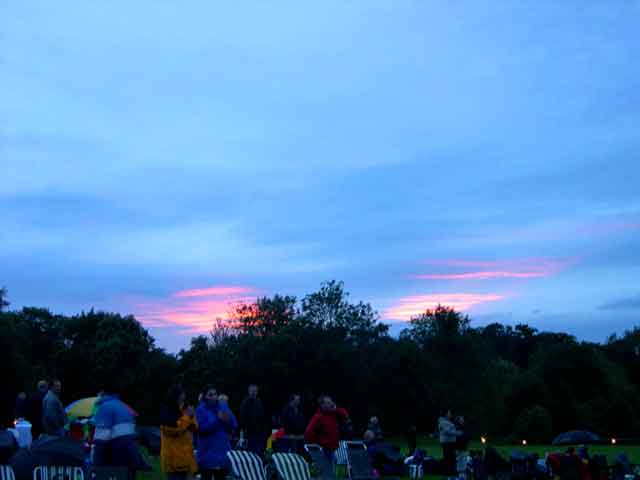 It stopped raining and offered a lovely sunset. The concert is still on - most people have just moved down closer to the stage. It is too difficult to fling your knickers at Tom if you are too far away.